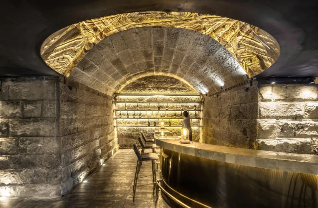 为了消解这种状态,设计师利用半圆形的吧台将其中两个防空洞进行了空间上的“桥接”,让酒吧平面变为以一堵老石墙为轴心的放射性空间,从而强化其整体感,而另一个入口被挡住大半的防空洞则被用作储藏空间(酒窖)。但这样的布局导致操作空间更加局促,因此酒架无法按照常规放在吧台的背后,而是被设置在防空洞的尽端,形成整个酒吧的背景墙。