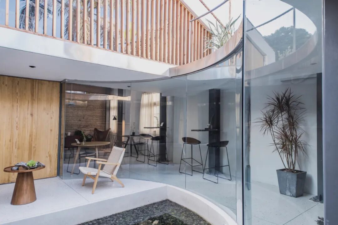 柱网结构和立面的曲面玻璃产生不规则平面,使一部分柱子位于室外,一部分位于室内,中心形成一个内庭院。
