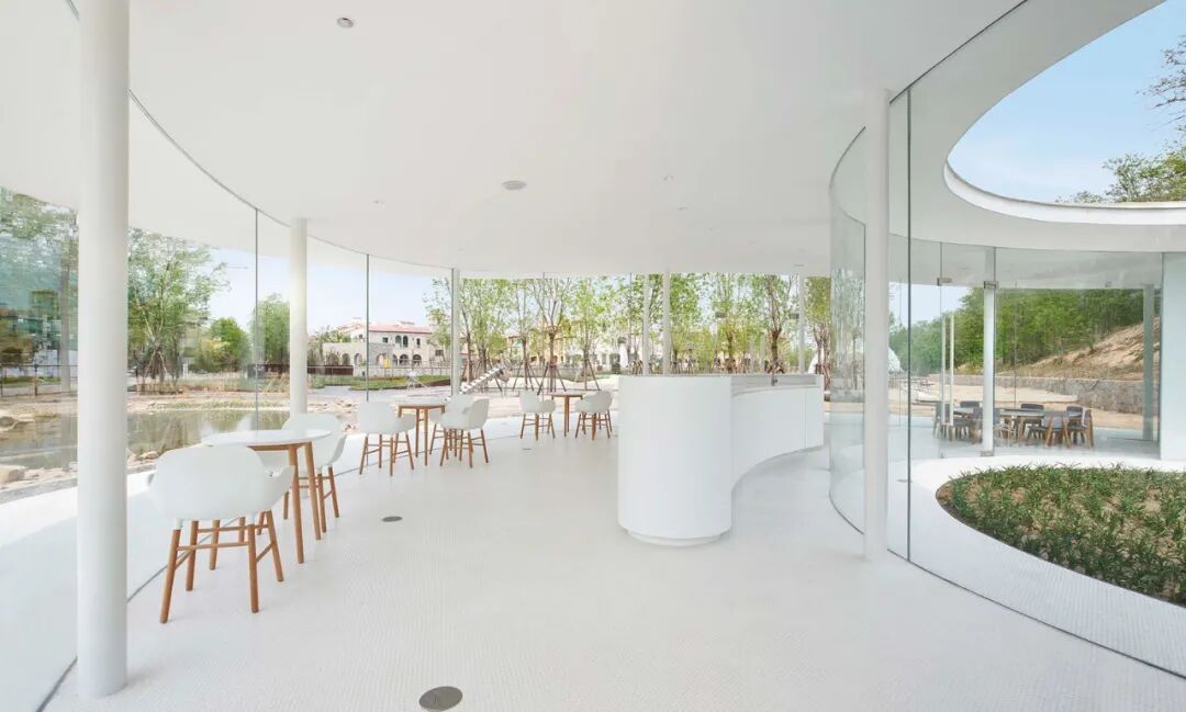 在这间由odd设计的咖啡厅内,不规则平面,曲面屋顶,引人进入的屋顶高起部分,为下面遮阴的低矮之处,形成一个有趣而不单调的空间感受。另外,120mm厚的金属铝屋顶和极其通透的玻璃立面,创造了一幅轻盈如风的画面。