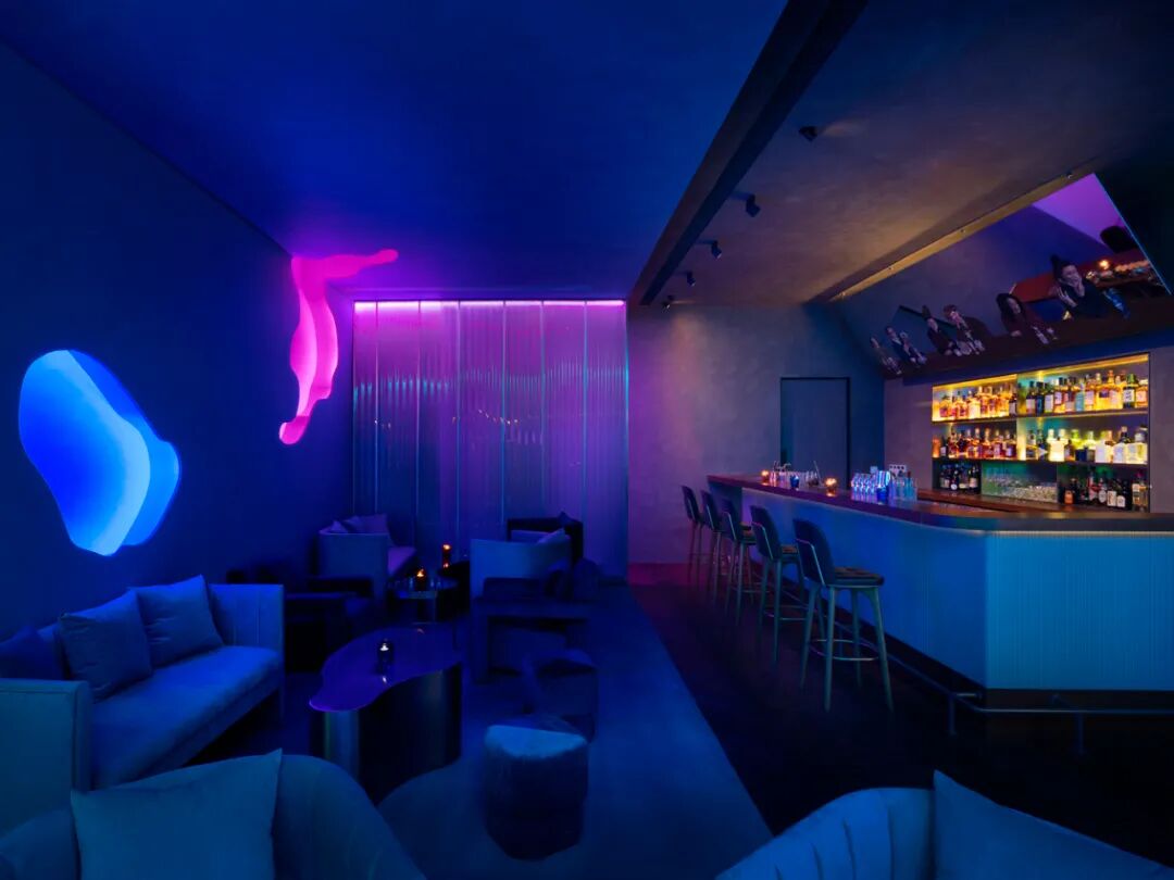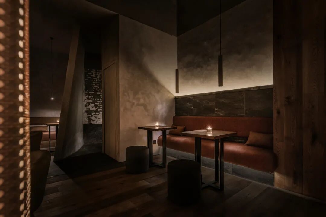 公共酒吧区和私密空间之间的空间自然过渡是通过弯曲的墙壁实现的,弯曲的墙壁以倾斜的姿态创造出一处半开放的房间,在场地之中确保了一定程度私密空间的存在。精心考虑的座椅设置使客人可以在每张桌子和椅子之间拥有足够的空间来喝酒和聊天。一些非固定的桌子和椅子则能够在特定情况下延展场地的开放空间,开展比如跳舞的社交活动。
