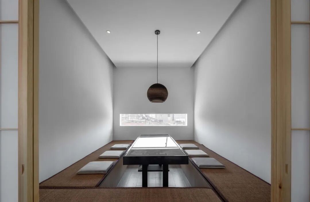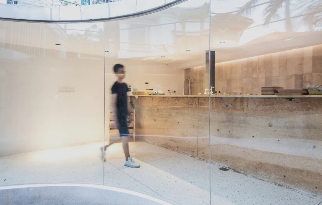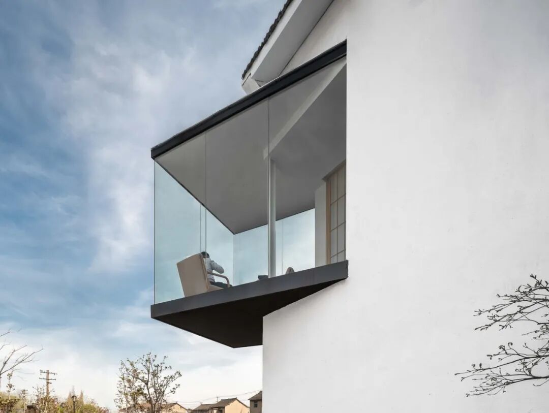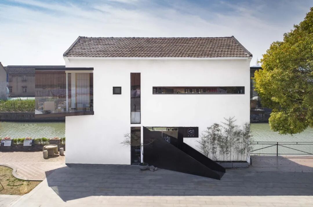 茶空间的材料特性难以持久,且涵濡着诗意般的冲动,白色的建筑墙面,现代穿插的玻璃盒子,水平线的一字条窗,经过改造之后别有一番韵味。