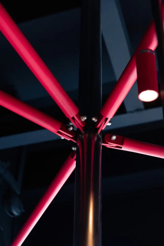 栋栖设计将弧形吧台由竖向不锈钢管以铰接的形式连接到顶面上。喷涂成红色的横向钢管,在离地三米的高度,和竖向的不锈钢管铰接。在强化和稳定了整个结构的同时,也承担了射灯灯槽的作用。