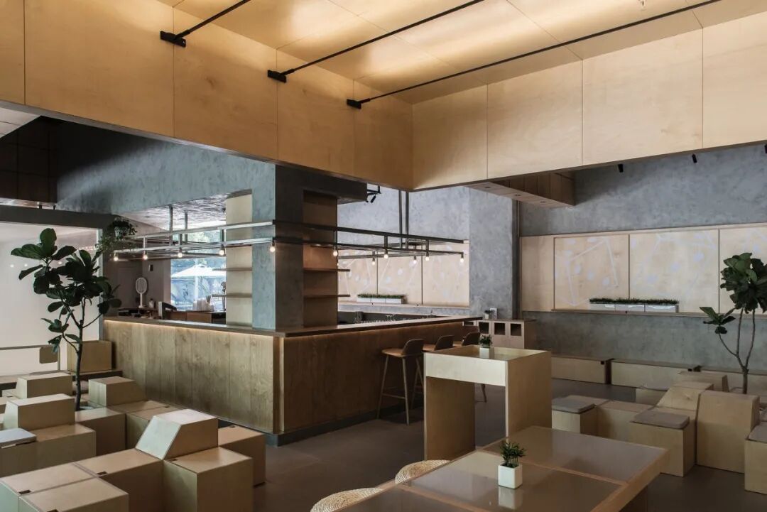 为了减少过多的视觉语言,设计师在室内反复运用了方形构成:从墙面的展示分隔、可移动的方盒子、到吧台上方的酒架。室内布局的核心自然是吧台操作区域,在环形的构造下,工作人员则可以兼顾到更多客人的需求。
