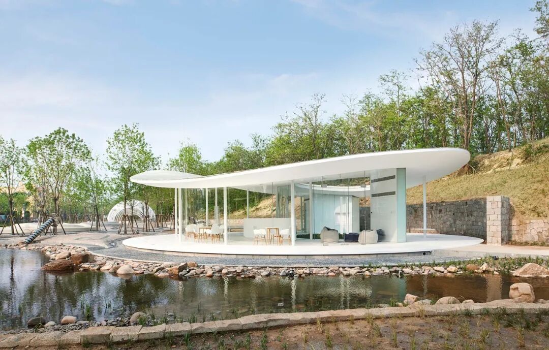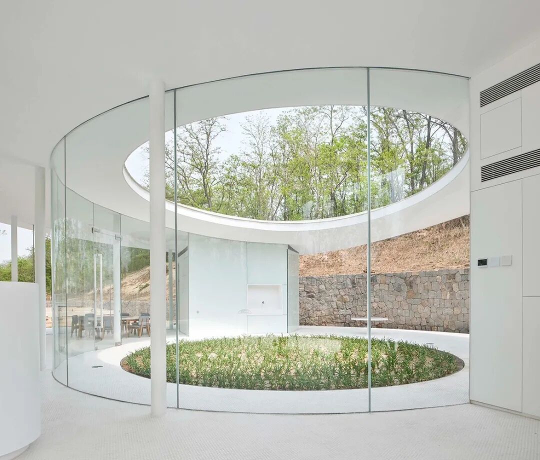 展览空间让进入室内的人从左右两边分流,沿着环形的玻璃幕墙,一侧是观展区一侧是景观水域,形成了环形的观展流线。当人走近中心的静水池,抬头就可以看到弧形的天空,这个场所将外部世界的自然变化引入室内,创造了多样的空间氛围。