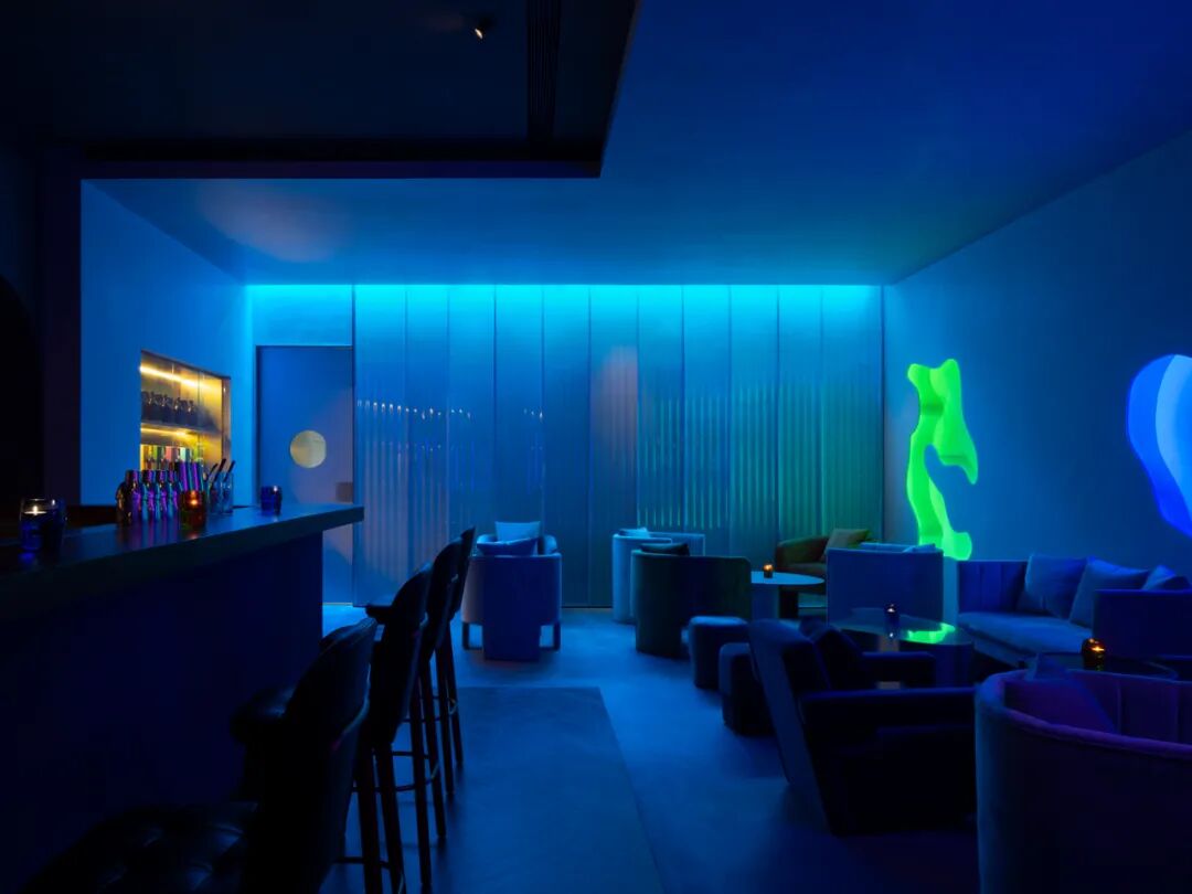 休息区被设置在画廊和酒吧之间,用来呈现现实和幻想的“之间”关系。通过扭曲的形状来表达的“之间”的概念,灵感来自达利富有表现力和神秘感的超现实主义作品——《记忆的永恒》。墙壁上的艺术形式来自画廊的几何形状,但它扭曲了,以昭示现实与幻觉的区别;同时揭示了一种自由,就像我们梦中的自由。