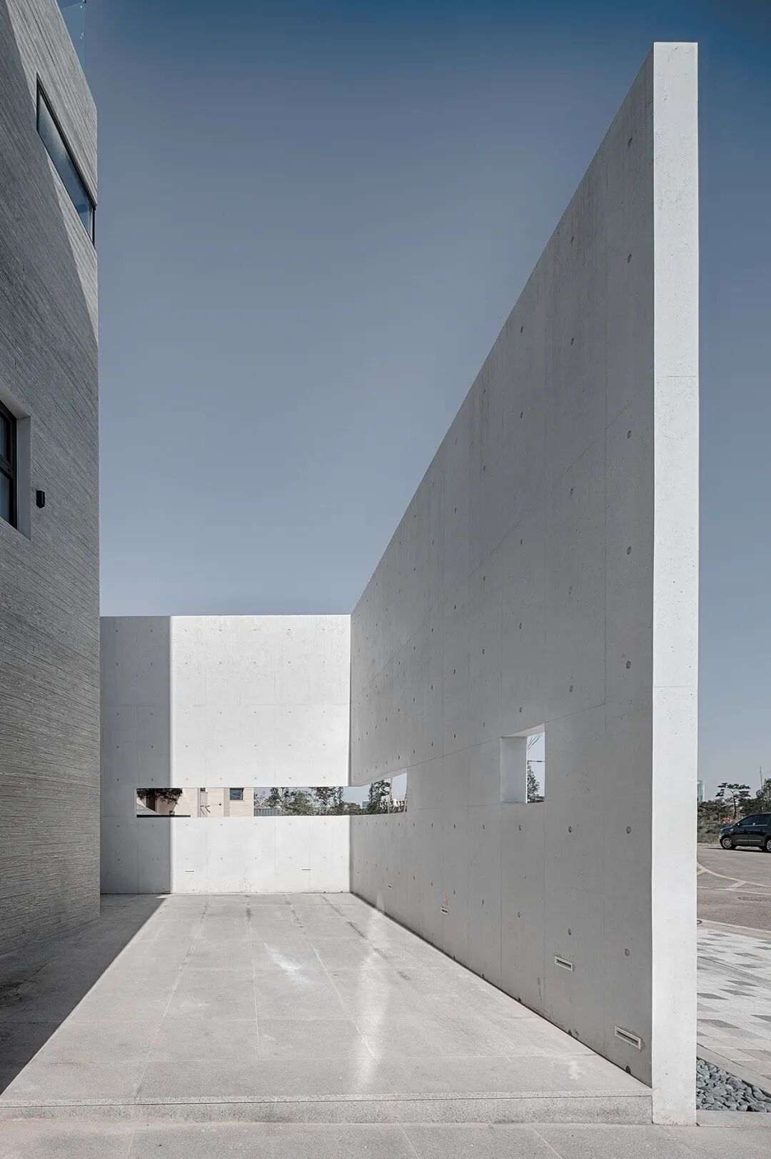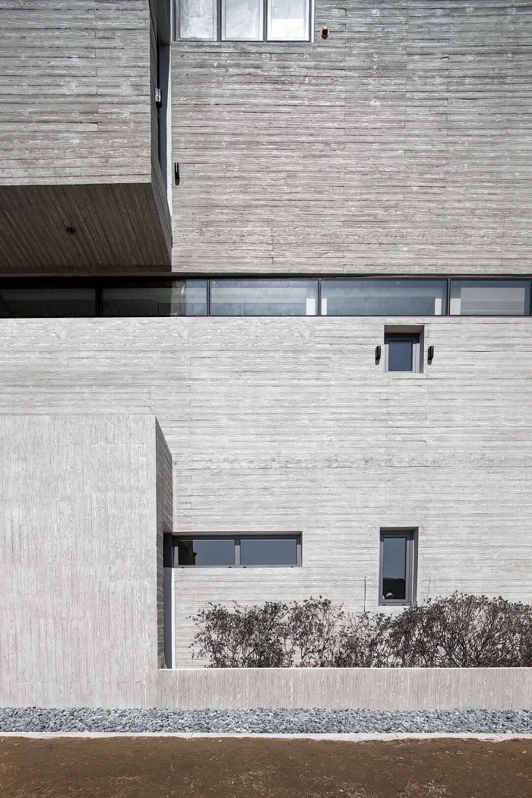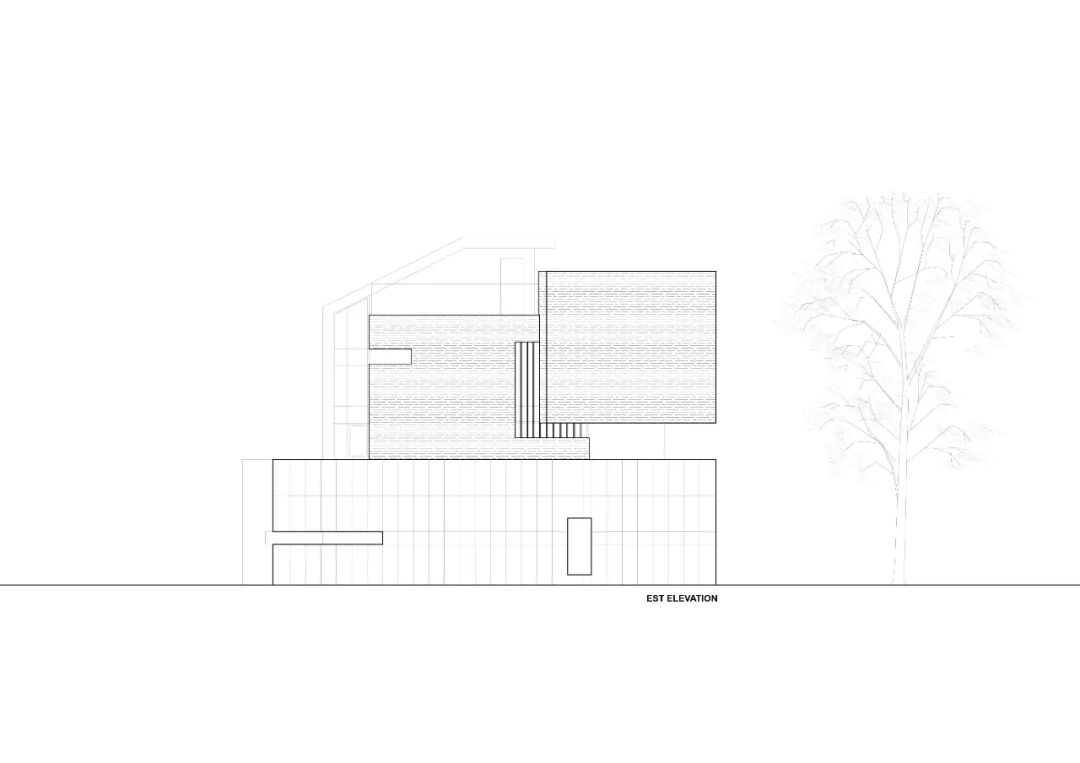 在面向住宅区街道的北立面,以及面向其他场地的东、西立面,我们决定尽量减少开口。建筑的北立面被分为3个部分,这种划分方法避免了因开口较少而导致的单调性。在直接面向街道的墙面上设置一个狭长的开口,以遮挡外面的视线,同时使住宅区的视野更开阔。