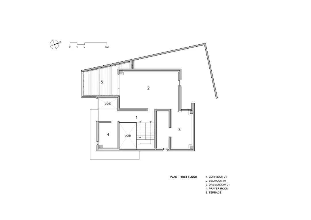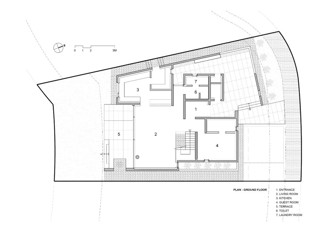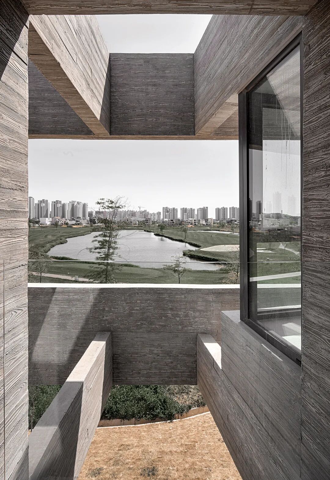 建筑北立面的设计与街道联系十分紧密,但穿过入口,到达客厅后,便能看到南面开阔的高尔夫球场,以及背后垂直展开的楼梯空间。