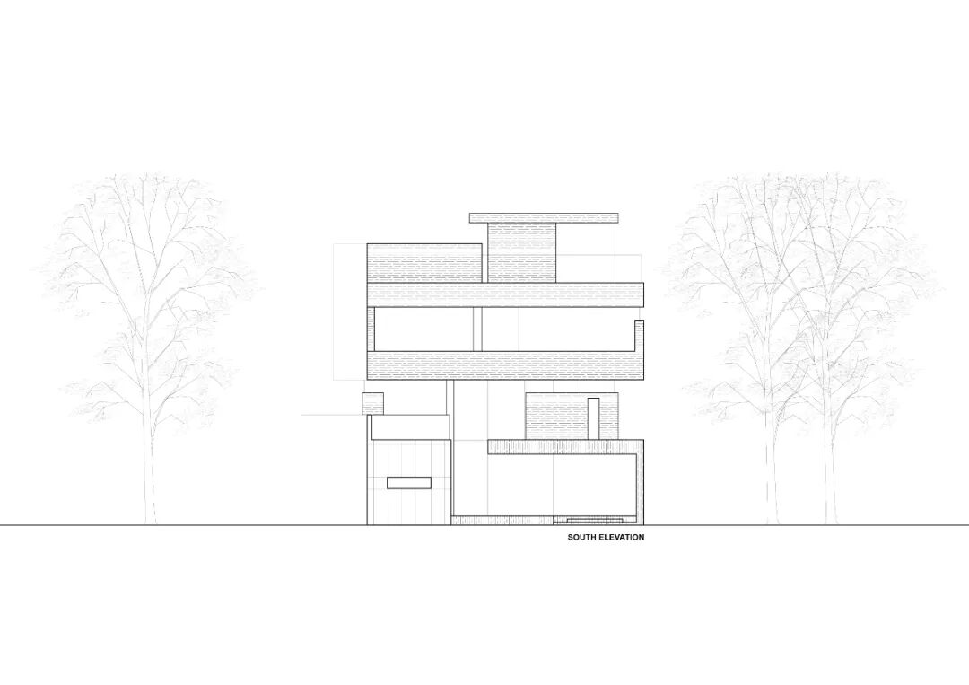 基地南面是高尔夫球场,北面正临住宅区的街道。该场地南窄北宽,与周边文脉不和谐。为了将南面的景色引入房屋内部,我们选择打开南立面,并通过假墙和百叶窗的设置,使每个开口框架中都包含这条视觉通廊。它们不仅在视觉上强调了水平框架的存在,而且还控制了进入的自然光量。