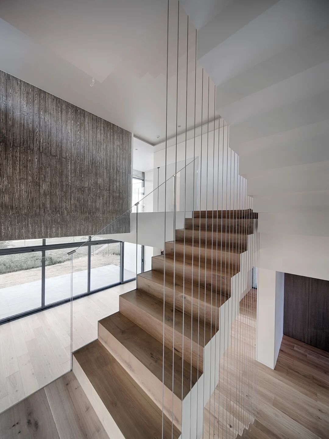 这种视觉空间上的戏剧性转变给居民带来了不确定的体验感。南面宽阔的水平全景落地窗带来了自然的宁静感,而垂直开放的楼梯空间则给家人们更多的交流机会。