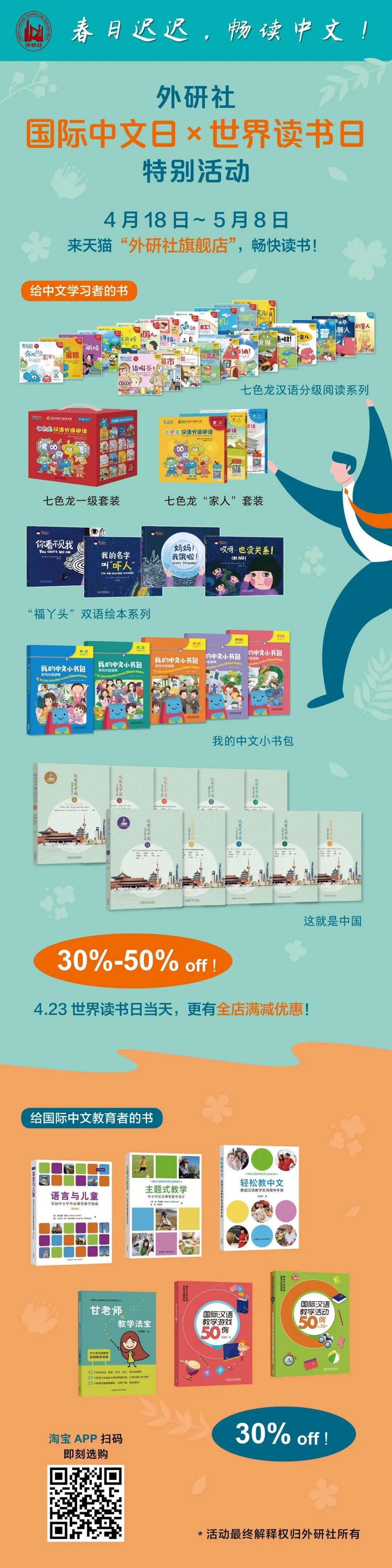 春日迟迟,畅快读书!在“国际中文日”和“世界读书日”即将到来之际,外研社联合外研社天猫旗舰店推出为期3周(4月18日-5月8日)的“畅读中文”特别活动。活动面向国际中文学习者和国际中文教育者,精选分级阅读和教师培训两大类近50种图书,开展5-7折优惠促销。春日渐长,让我们一起畅快读中文,共度好时光!