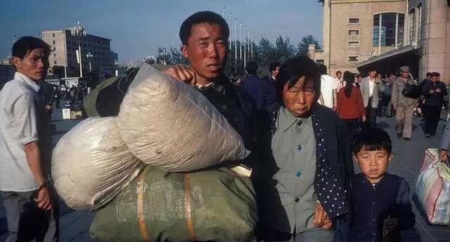 一家三口正在火车站,朴素的面孔,改革开放后掀起了打工潮,很多农村人员进城务工。