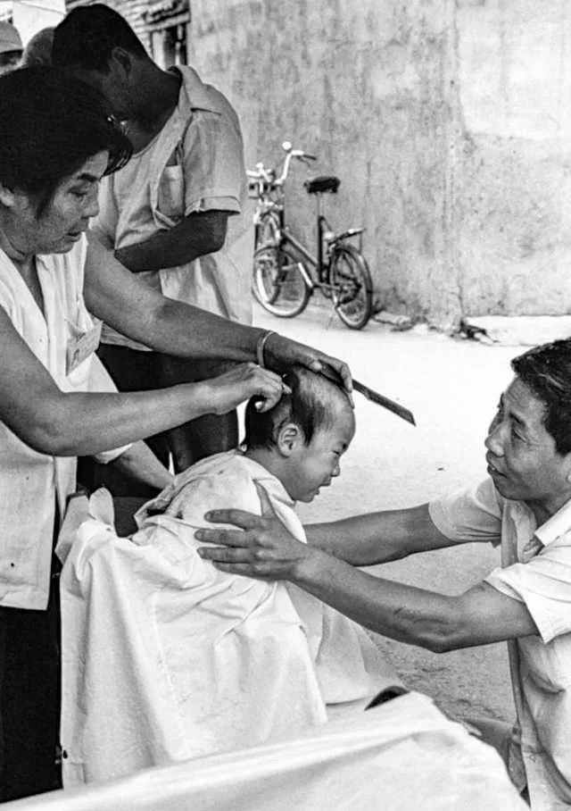 1988年,河南濮阳,农村孩子理发。
