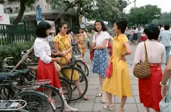 1980年,在北京的一个公园里,一群时尚女性的飘逸发型。