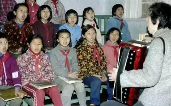 1980年代,老师用手风琴教我们唱歌。