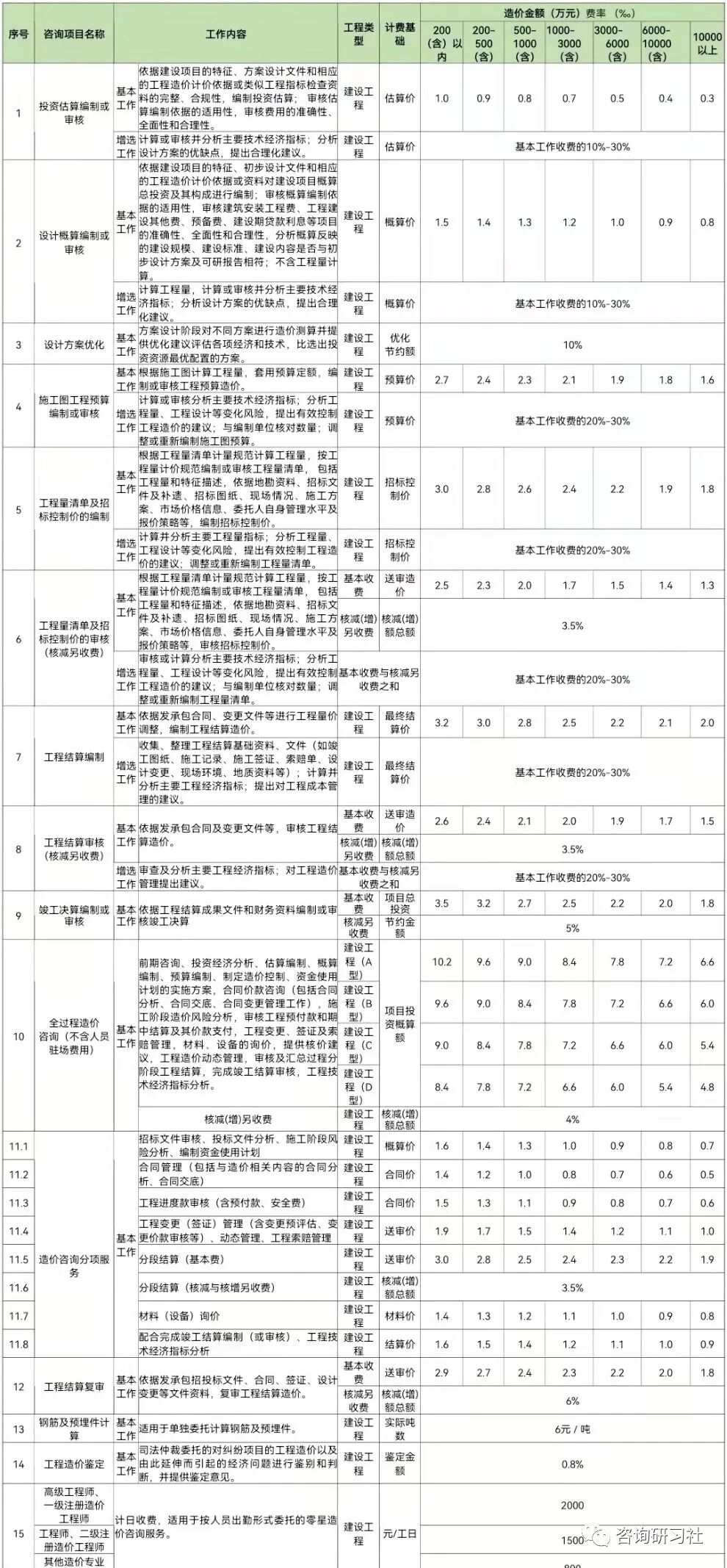 1、单独“编制工程量清单”咨询服务按“2.编制工程量清单及计价”同档费率的60%计费。