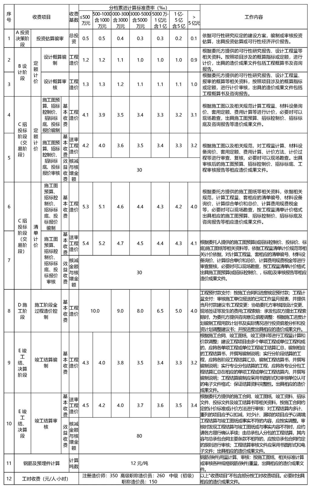 (二)、工程造价编制业务以编制成果的工程总造价为基数,钢筋含量按类似工程含量参考执行;单独委托钢筋(铁件)抽筋计算、审核,按施工图纸、设计标准和施工操作规程计算或审核各种规格钢筋(铁件)重量,提供完整的钢筋(铁件)重量计算书、汇总表,按第七项标准计收。