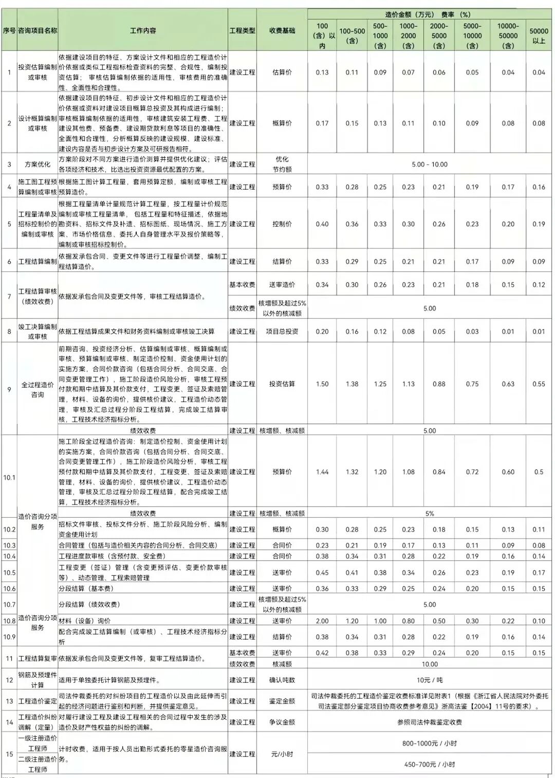 10.全过程造价咨询、施工阶段全过程造价控制,不包含方案优化、各类招标代理、驻场人员费用,发生时另行计算。