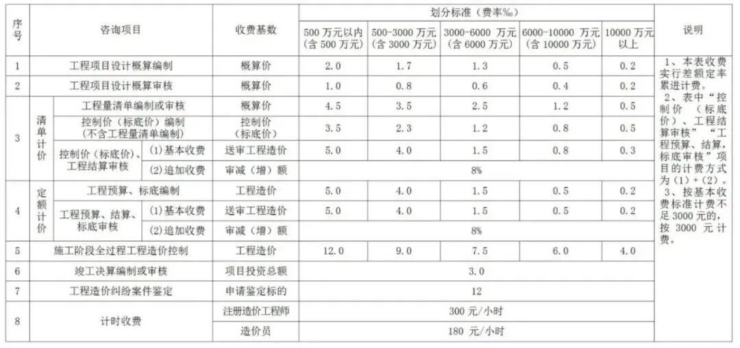 一、本表收费实行差额定率分档累进计费,当单项工程咨询服务收费不足3000元的按3000元计。