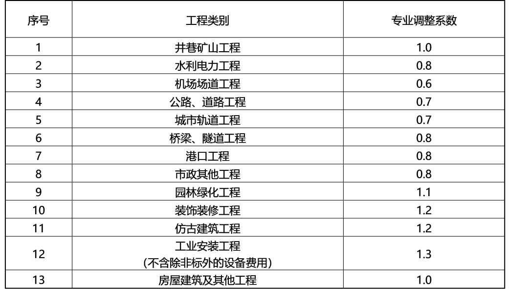 1.房屋建筑工程和其他未涵盖的专业工程调整系数为1.0;
