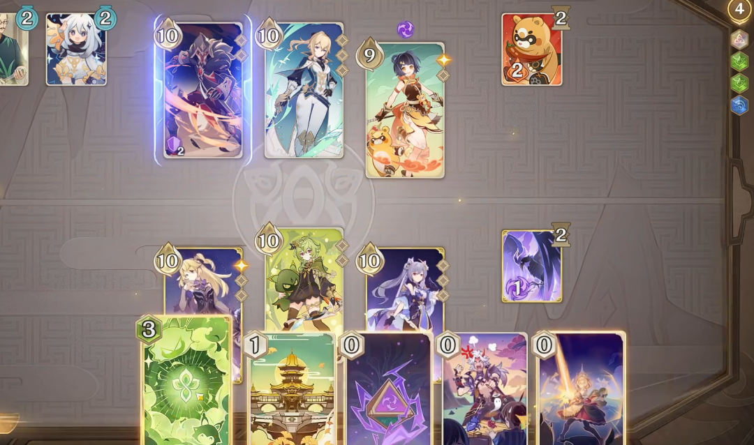 在对局中我们能够利用的一切手段,只要能帮我们取得胜利,都是资源。常见的像手牌(甚至牌库里的牌)、骰子、血量、角色、召唤物等等。充分合理地将各种资源进行整合,巧妙利用,就能在牌局中紧握胜利的权杖。