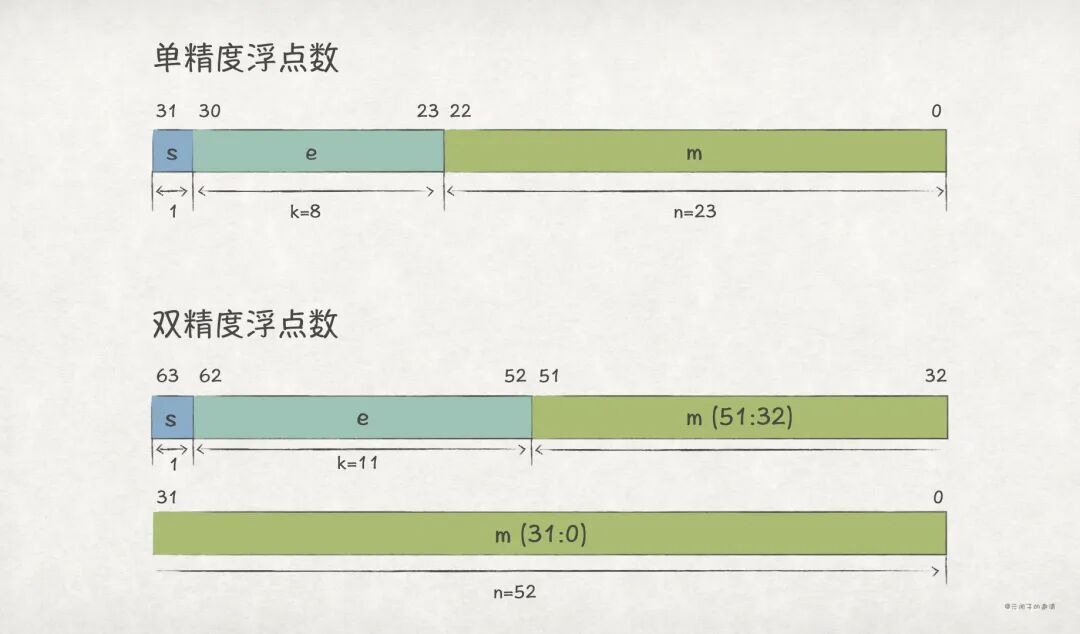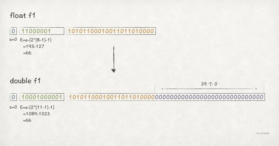 float 的 k = 8,而 double 的 k = 11,所以两者的 e 会有所不同。float 的 n = 23,而 double 的 n =52,所以 m 需要低位补 52 - 23 = 29 个 0。// Java