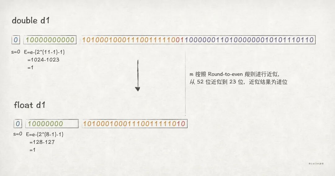 float 的 k = 8,而 double 的 k = 11,所以两者的 e 会有所不同。float 的 n = 23,而 double 的 n = 52,所以转换到 float 之后,需要进行截断,只保留高 23 位。// Java