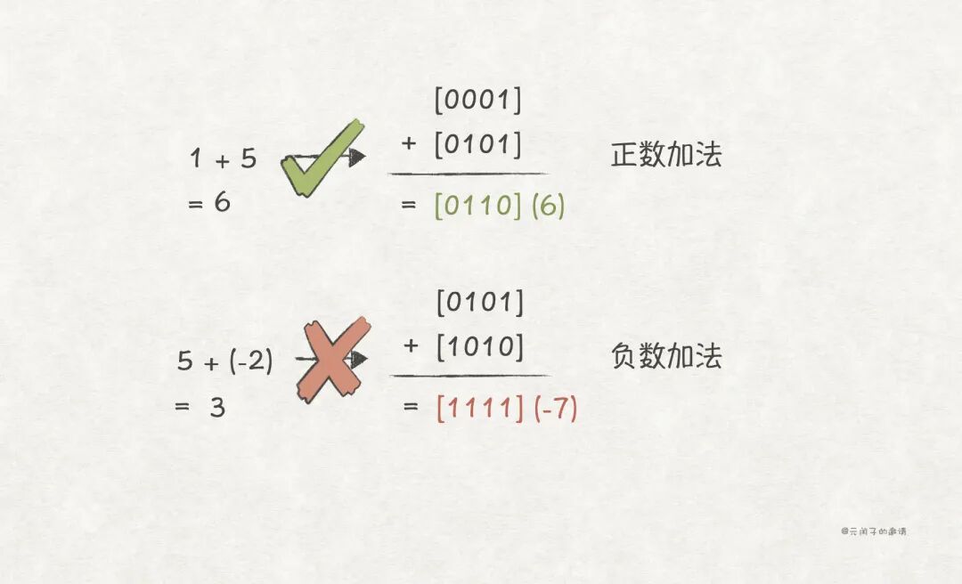 原码编码方式下,两个正数的加法没问题,一旦带上负数,结果就出错了:
