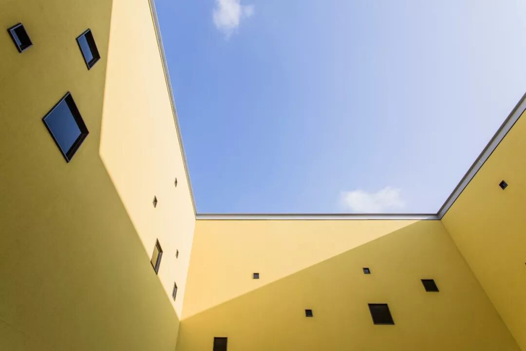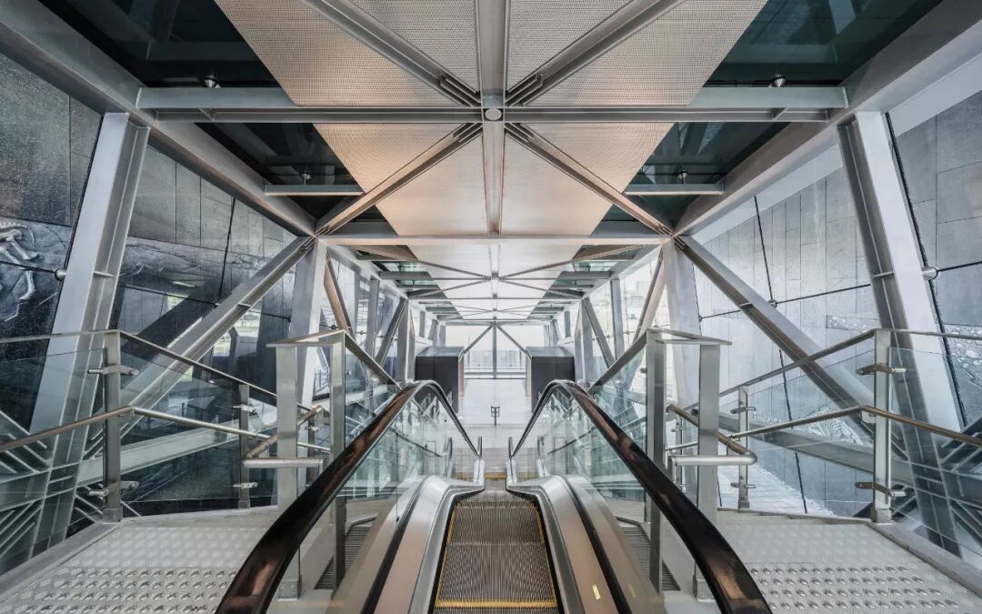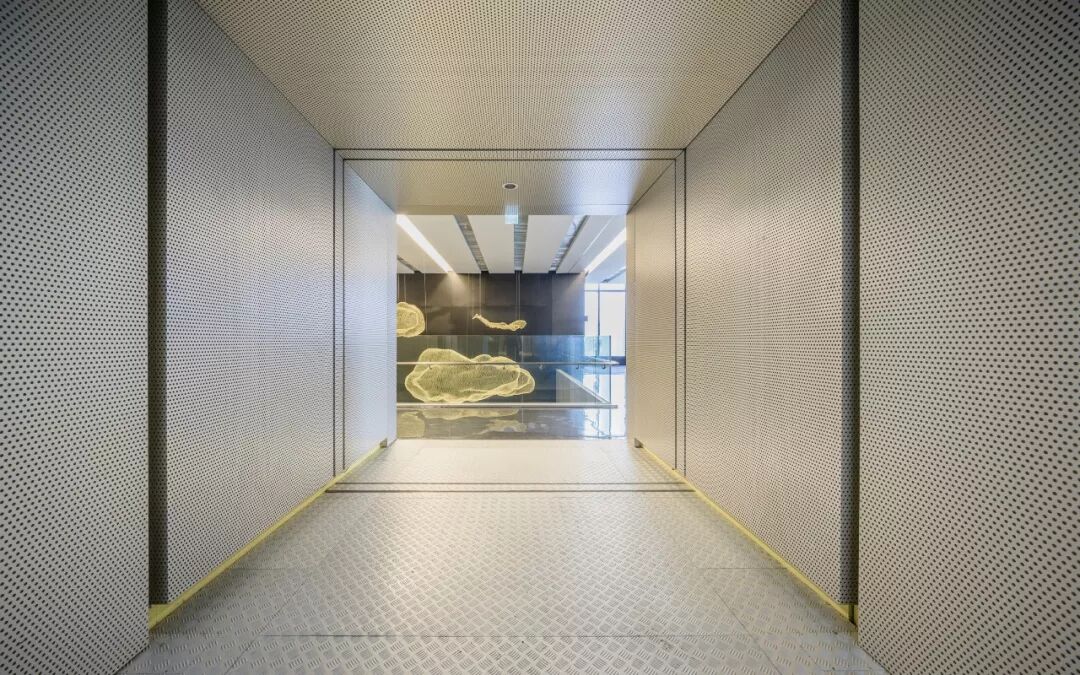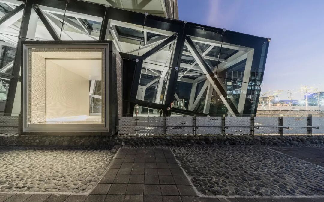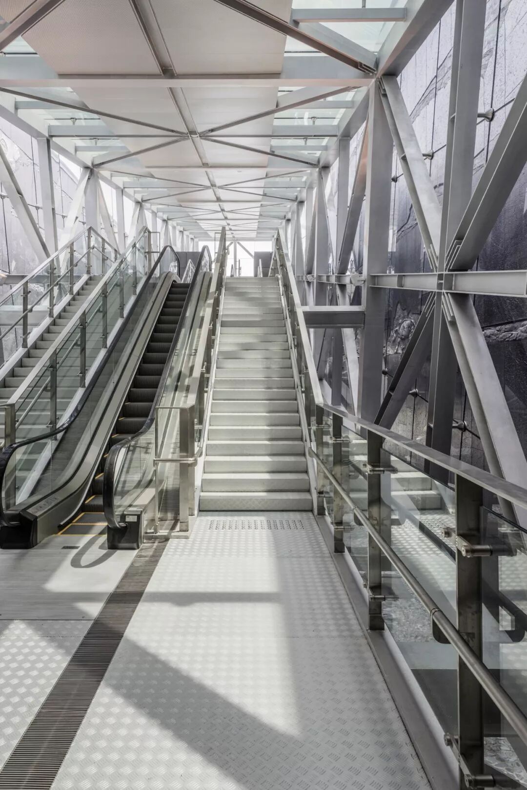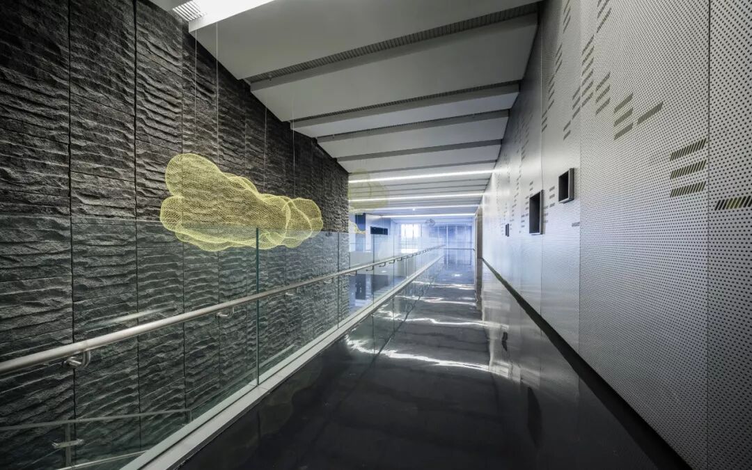 本基地紧临高速铁路轨道,平均每几分钟即有一辆高铁列车会经过,过程中约3.5秒会与本基地比肩相邻。巧妙地运用乘客的高铁体验,透过动线的设计让访客先穿越方形的玻璃通道,在频繁经过的高铁车次中,让每个访客都能穿梭「现代」,眺望这趟最新、最快的交通技术和科技园区设施,仿佛正在见证未来;
