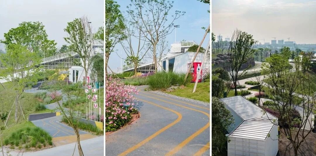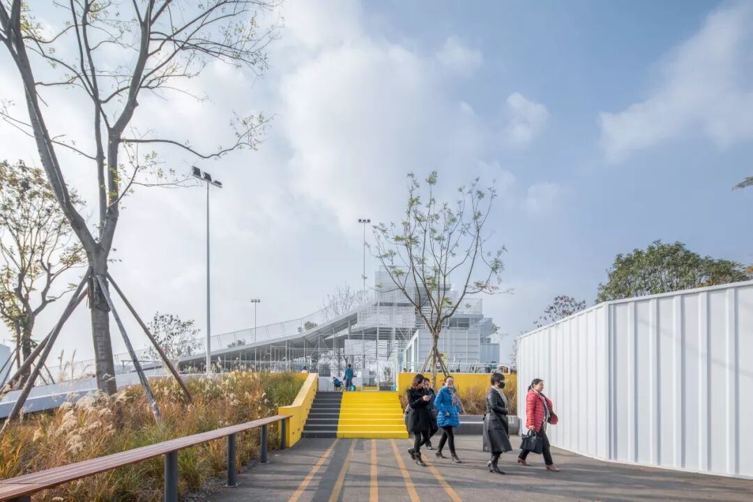 景观通过鲜明的色块与线条布置,让建筑与场地融合,通过色彩提升整个区域的辨识度。一条线型的通道将体验者由车行道引入至场地中,深色地面搭配亮黄色线条,运动感十足,同时起到了指引的作用。