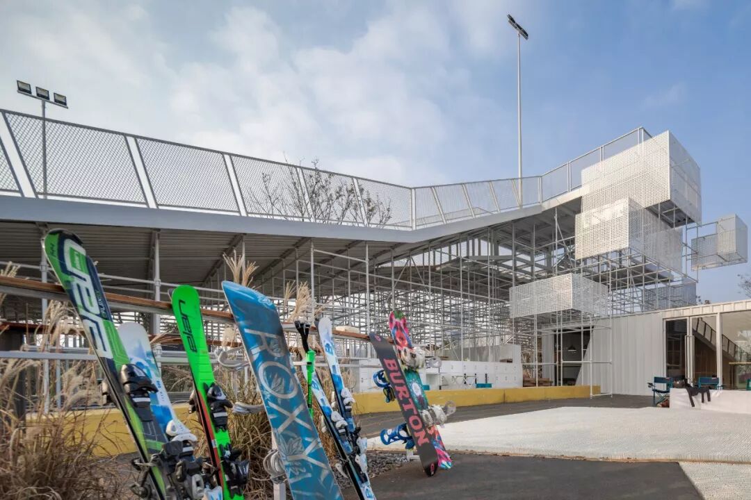 在满足业主提出的接待厅,咖啡厅,储藏室,卫生间等空间需求的基础上,我们还在方案中尝试了不同材料形式,从木结构到白色脚手架,意在以最简约的构造体系,完成项目的搭建,营造最贴切的滑雪体验氛围。