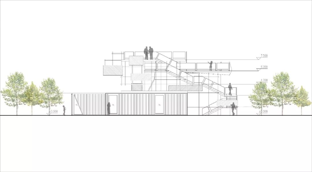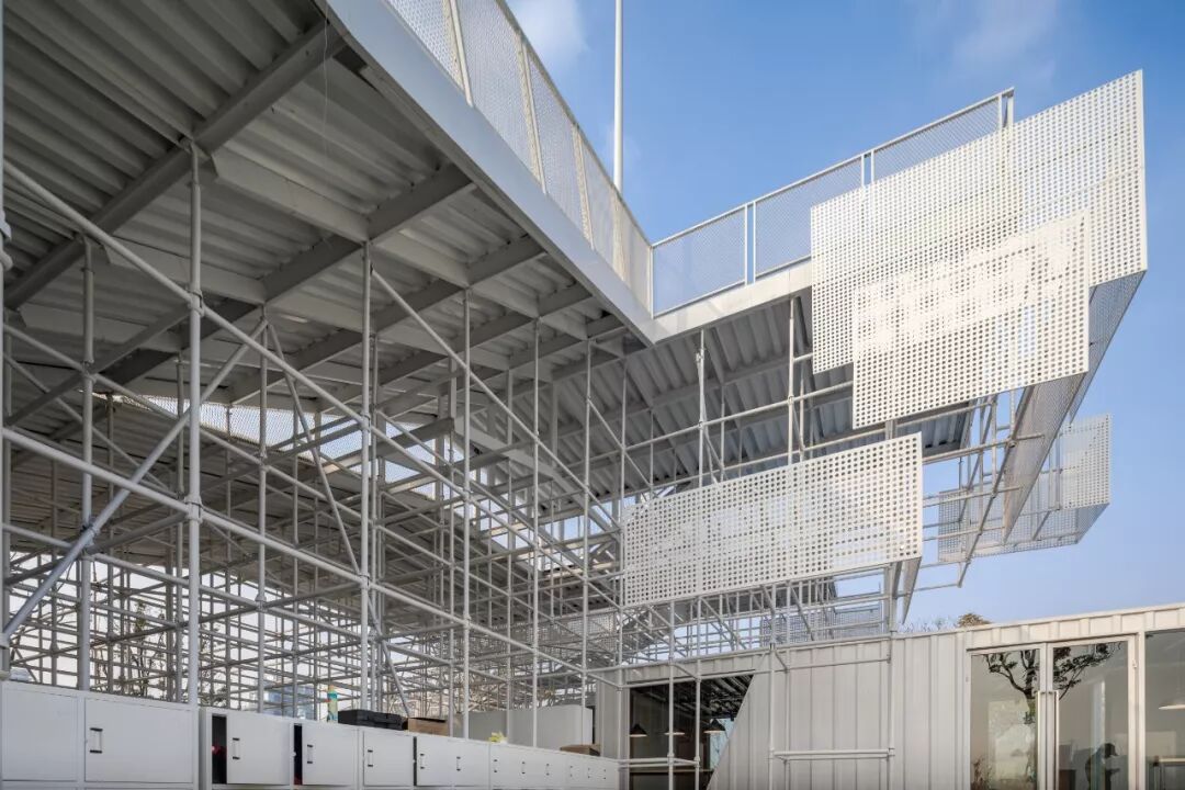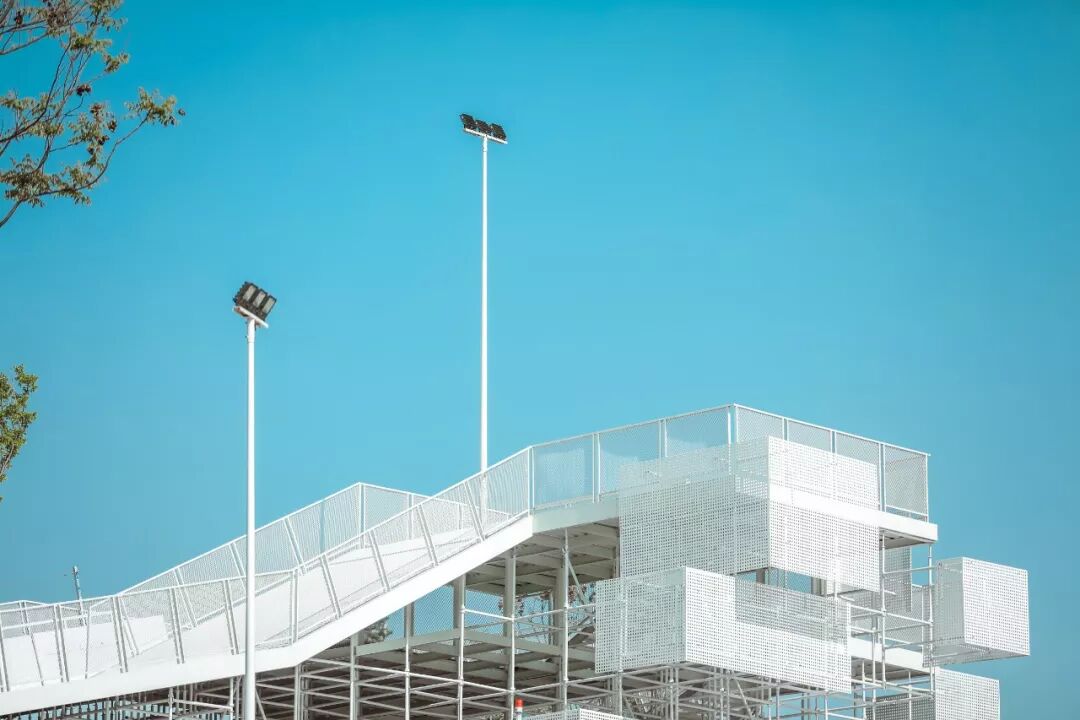 项目通过不断的结构方案尝试,最终将错动及掏空的体量关系通过脚手架的表达落地。白色的脚手架结构轻盈通透,增加了雪道的漂浮感。钢结构楼梯从脚手架结构内部的挑空空间穿过,环绕到主体外侧,让游客在上升的过程中可以欣赏到周围的景色。