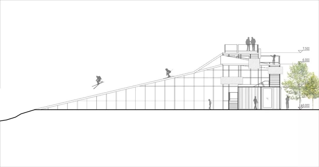 由统一的前场准备区进入,一边是直接接入的初级道,保证初学爱好者穿着雪鞋不用穿行太远距离;一边是通过搭接的脚手架构筑平台,上升到15米的中级道出发平台,体验更有速度的滑行感。