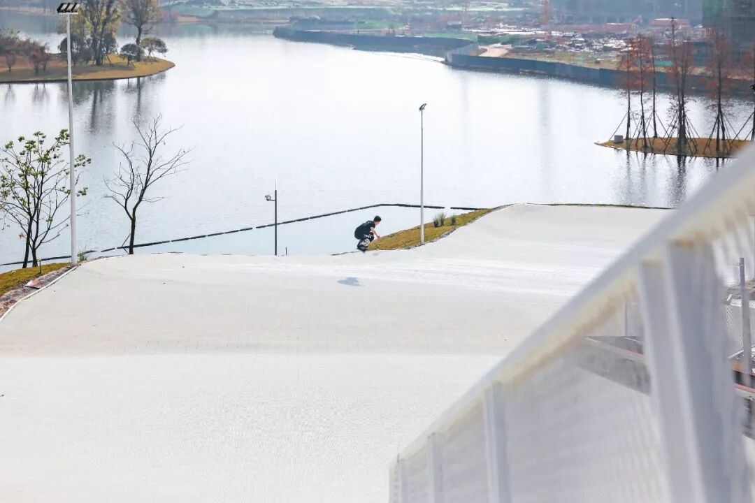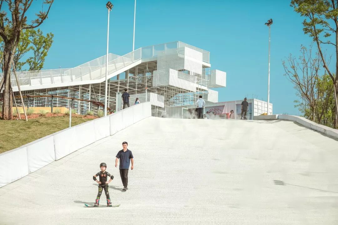 麓客岛旱雪场,位于成都“麓湖水城景区”2400余亩湖域中央的“麓客岛“,岛内项目通过建筑的定制化设计,为亲子活动主题创造了同样多样的空间体验,这些具有一定实验性的景观建筑,成为了麓客岛上特殊的风景。旱雪场项目受业主方委托,在朝向湖面的自然坡地上布置分别满足20米宽的初级旱雪道及30米宽的中级旱雪道,作为初级滑雪者的练习场地。