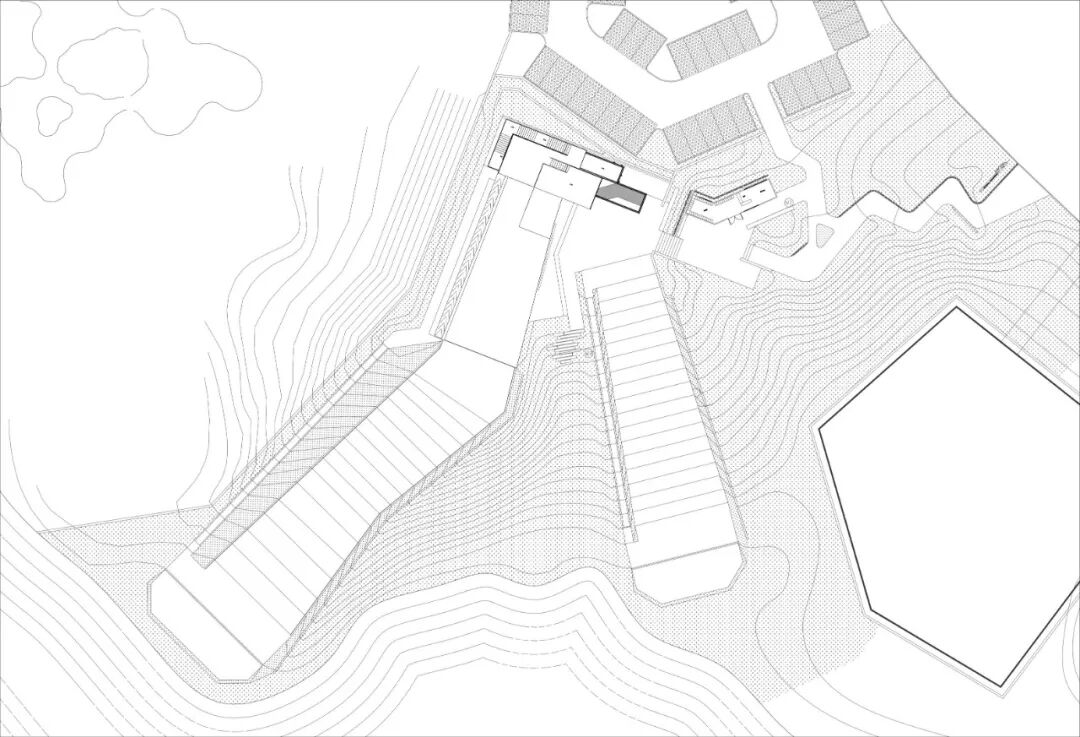 项目直接临湖,保证雪道尽量与湖岸线垂直布置,将朝着湖岸尽头滑雪冲刺的过程作为项目的核心体验。由于场地纵深较短,且高差坡度有限,经过与业主方的反复验证,最终采用两根滑道分行的方式。