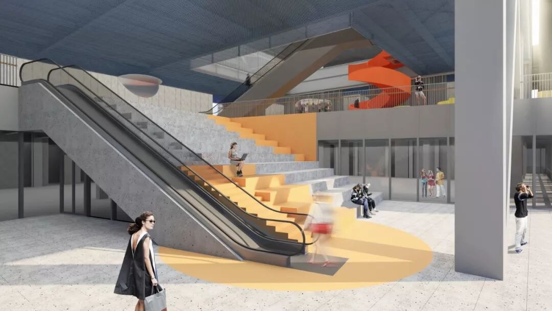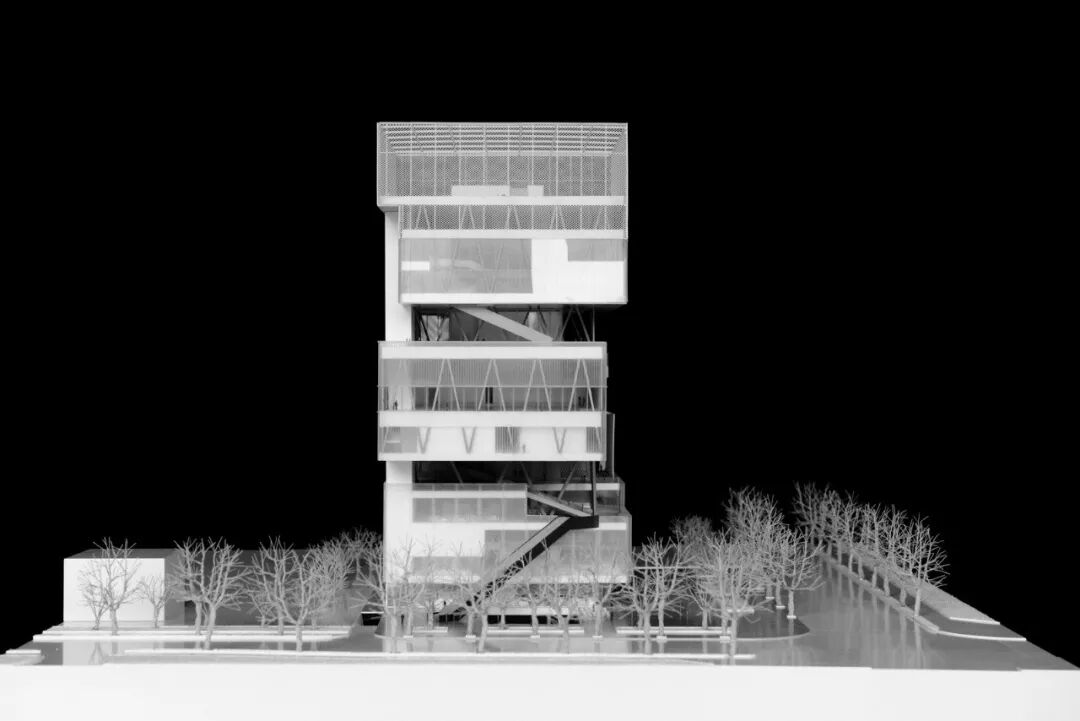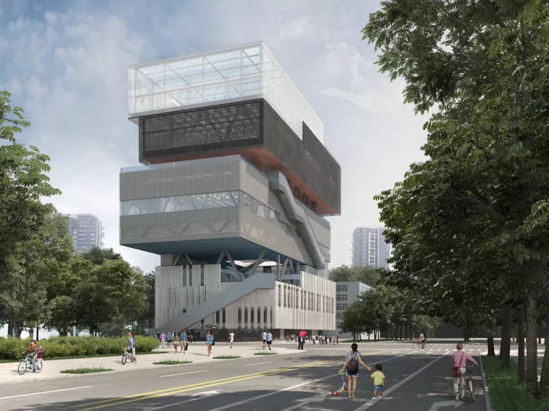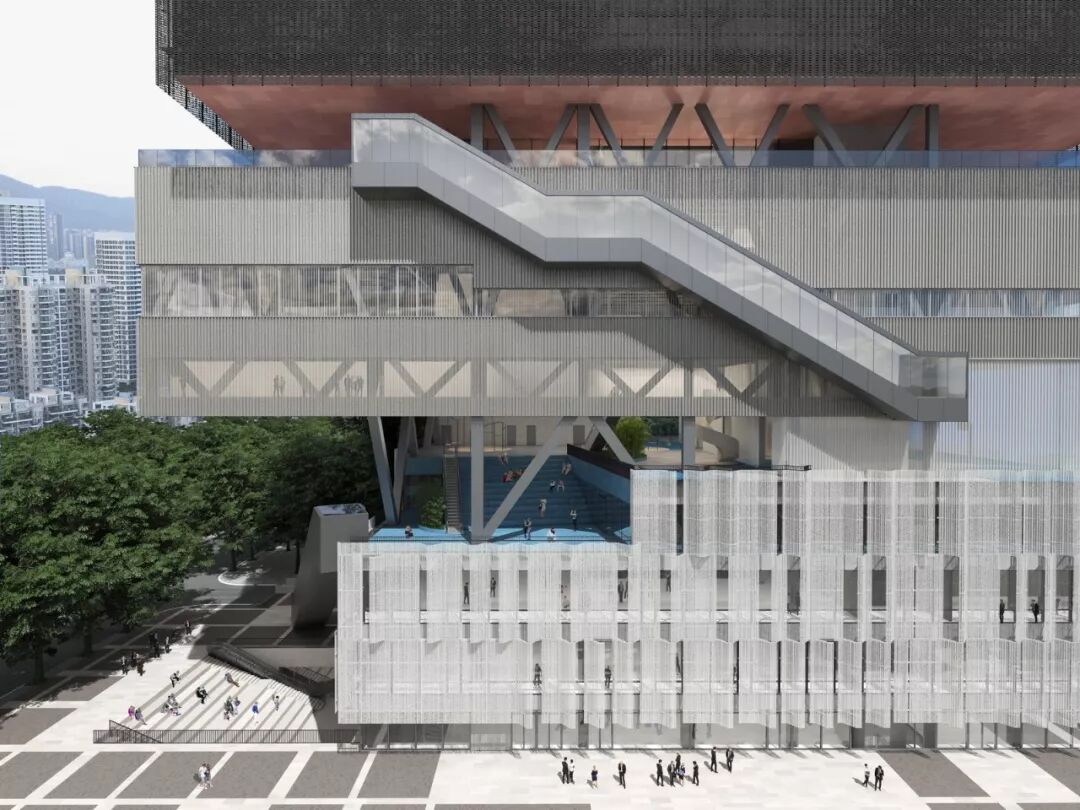 在粤海文体中心的设计过程中,在保证各类场馆功能独立运营的基础上,建筑师尽可能多地提供城市开放空间,以促进各馆使用者之间的互动。建筑本身因占地面积受限而不可避免地走向立体化。因此,都市实践尝试突破城市开放空间仅限于地面广场的概念,将其抬升至空中并与建筑体量在垂直方向上进行叠加,由此形成若干相互连通的空中公共活动平台,在建筑的不同高度上都能提供良好的与城市互动的体验。在此基础上进一步打破水平各层之间的空间界限,置入灵活使用且更具公共性的新功能,使平台层成为激发都市活力的空中城市客厅。一个立体化的文体建筑类型由此产生。