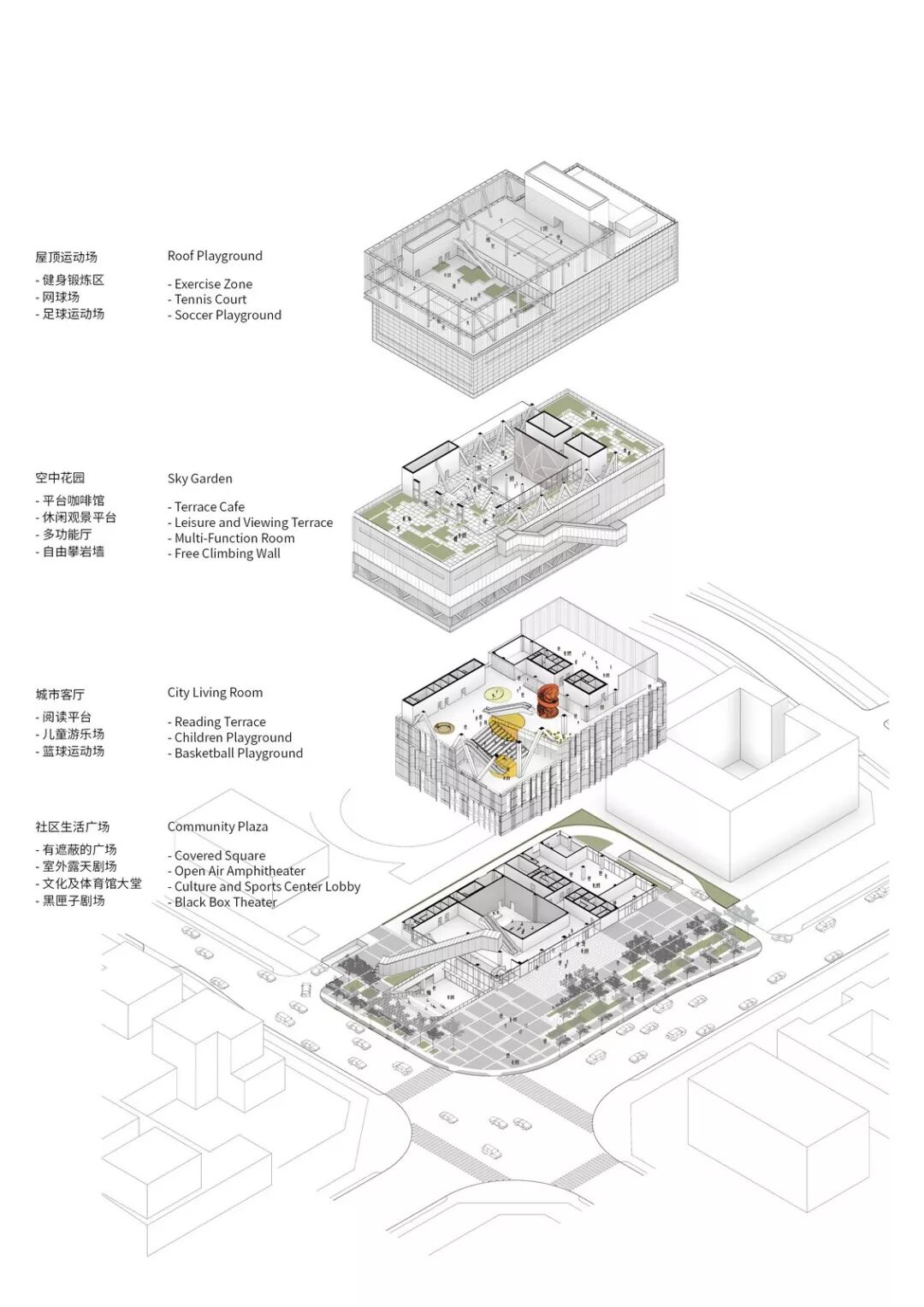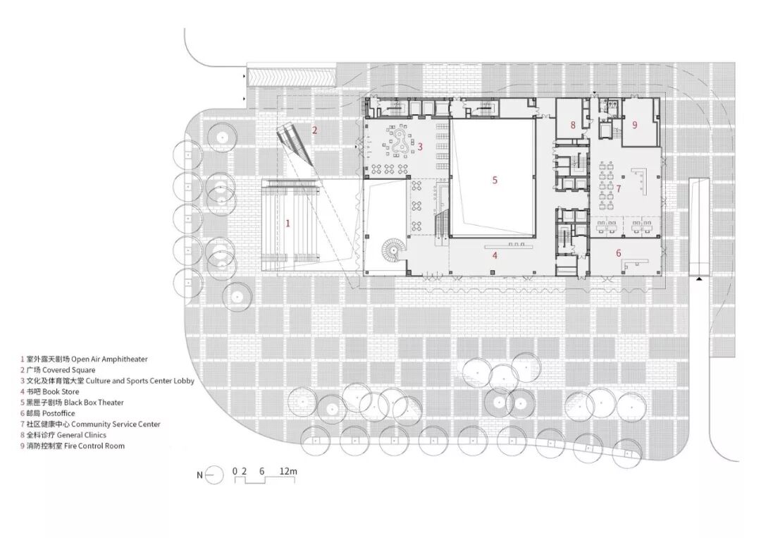 传统的文体中心中,各类功能空间往往相对独立封闭以避免使用上相互干扰,这就使得整座建筑成为纯功能性场所而非积极的社会交往空间;而围绕在建筑周边看似零散的城市开放空间因提供了不同人群之间互动的多种可能性,反而成为这些文化场所真正活力的来源。