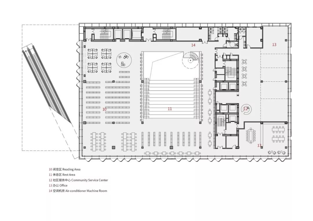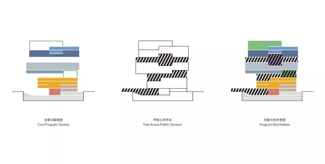 主要功能空间的分布综合考虑了空间使用效率、结构合理性及对环境的影响等各方面因素。图书馆被设置在最靠近地面的体量中,给予其最佳可达性,同时其规律的柱网作为上方的大跨度空间桁架的支撑,保证了结构上的合理性。