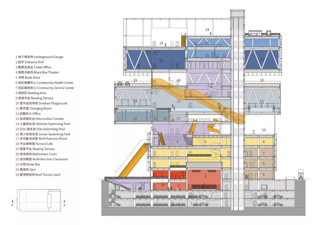 3个功能体量以及位于不同高度上的城市公共空间,并非同质化地均匀分布,而是拥有各自不同的功能属性和场所氛围。“社区生活广场”最为公共开放,是前往社区服务、图书馆、运动场馆的各类人群汇集的场所;“城市空中客厅”是文化类功能和体育类功能的转换层,室外网球场与24小时图书借阅处都位于此处;“空中体育花园”则提供室外健身场所,视野最为开阔,环境最为安静放松。3个城市平台之间由公共大扶梯串联,共同构成了一个立体的24小时开放的街区公园。