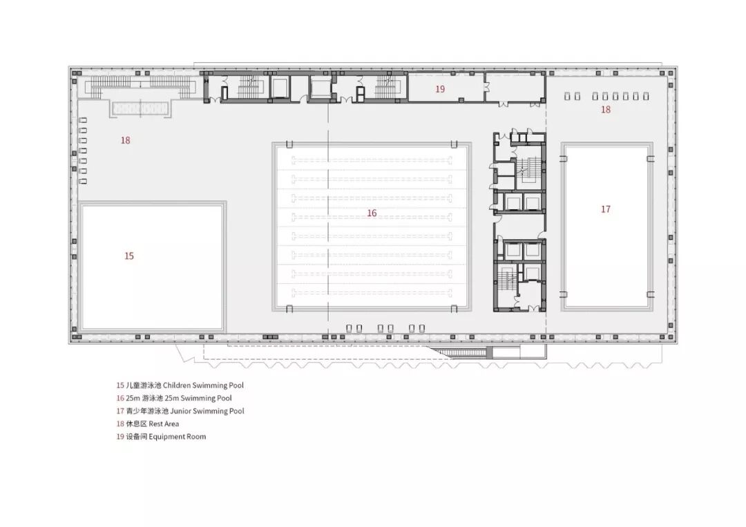 游泳馆置于建筑体中部,其下方半开放休息区成为空中城市客厅。空中泳池不但拥有极佳的城市视野,其自身突出的体量也成为城市景观的一部分。最具活力的体育场馆被放置在建筑的最高处,以最大限度减少对周围环境的噪声干扰,其下方的空中体育花园可作为居民热身和户外锻炼的场地。
