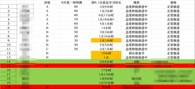每位班主任都有各自班级的ABC表格,并且根据学习态度、检测成绩、学习时长每周更新。