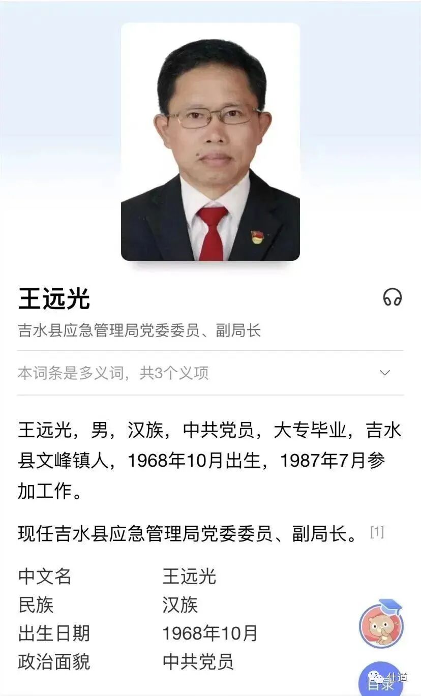 出人意料的是,政道君查了一下百度百科,王远光的职务,前几天还是“现任吉水县应急管理局党委委员、副局长”,目前已经变成了“吉水县应急管理局原党委委员、副局长”。据吉水县人民政府官网最新显示,王远光已不再担任县应急管理局党委委员、副局长。