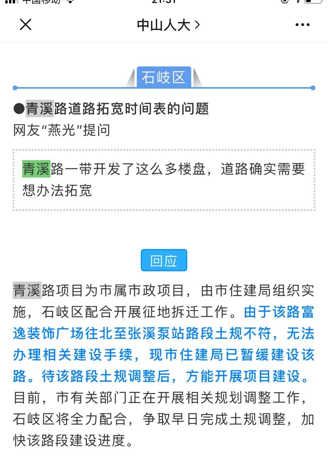 可惜的是,招标文件后再无下文。直至去年(2019年5月28日),中山人大公众号回应网友询问,提到青溪路相关情况: