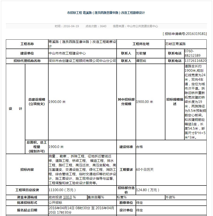 翻查记录,青溪路(莲员西路至康华路)项目早在2016年曾经在中山公共资源交易中心发布公告招标。