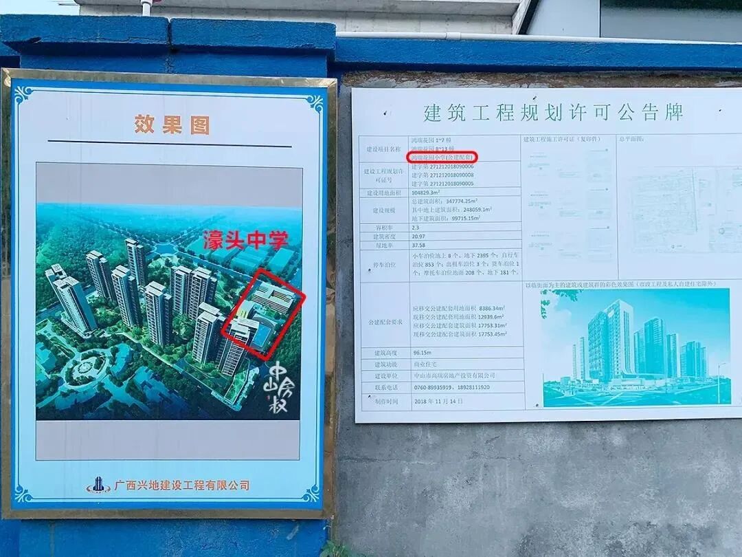 在项目公示图可以看出,小学位置处于鸿瑞壹号的东北侧,挨着濠头中学。