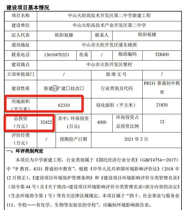招标文件显示,火炬二中新建工程总投资32422万,位于环茂二路南侧(开发区黎村北侧),用地面积62310平,建筑面积共计 68800平。