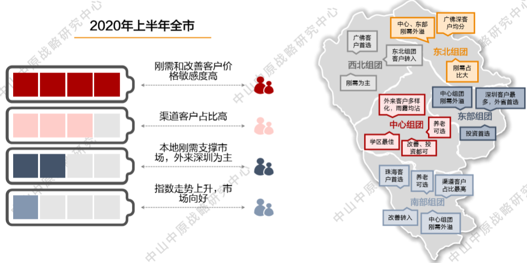 新增住宅(不含商业公寓)面积段占比方面,100-120平刚需户型以4721套占主导,其次是120-144平改善户型,有2524套。各组团商品房新增供应套数走势上,中心组团商业、住宅量最大,其次为西北组团。截止2020年6月30日,全市住宅存量共70577套,环比下降10.24%;全市住宅去化时间约19.9个月。2020年截止6月30日,全市平均去化时间为19.9个月。分镇区来看,去化时间最长的是板芙镇需要32.4个月,主要是该镇区近期网签较慢,去化时间较长;去化时间最短的是阜沙镇需要8.2个月。2020年上半年,在售项目来访量约161546批,实际成交量约12359套;2020年上半年成交转化率约7.7%,同比2019年上半年有所下降。因为地域发展不均,中山各区域客户情况也大有不同,其中客户量最高的区域为中心组团。