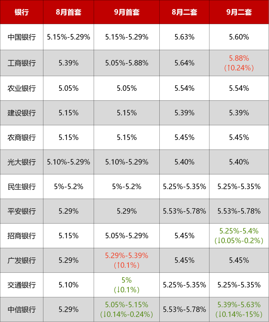 房叔致电了12家银行了解到,目前各行首套房主流利率基本在5.05%-5.29%之间,具体情况请看下表: