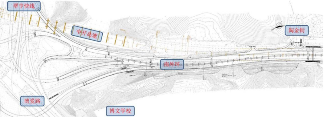 据文件显示,南外环东起火炬西互通出口,西至G105国道,全长约14.9 公里,设计车速80km/h,现状为双向六车道,路基宽为56/40m,为连接中心城区和东部组团的重要通道。受中开高速福获路隧道出口的影响,项目起点路段线位整体往西北偏移约37米。![]()