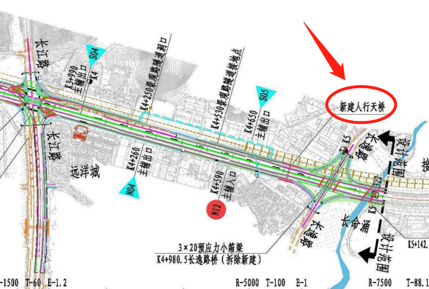长江路立交部分,新增一条北-东匝道(长江路-南外环方向),实现主路东西向、北往东、北往西方向的快速、便捷交通转换,为连续交通流。