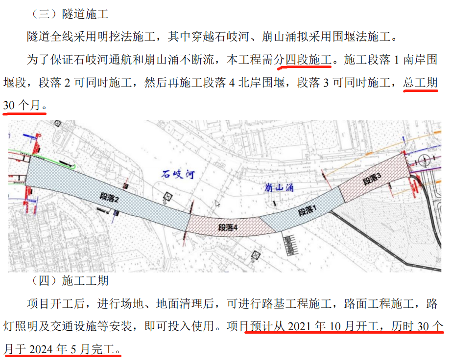 过江隧道工程需分四段施工,总工期30个月,预计今年10月开工,于2024年5月完工。